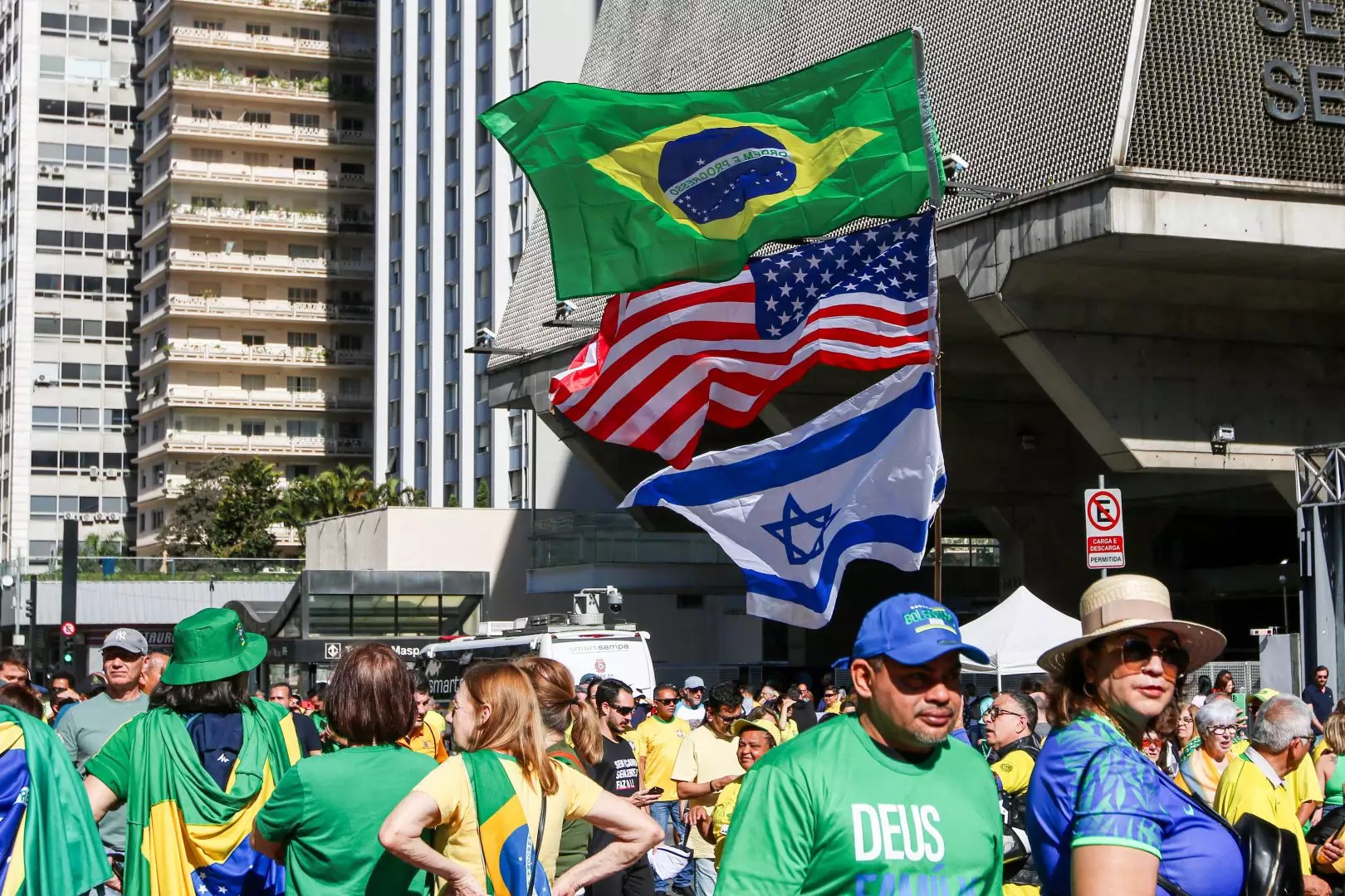 Bandeiras dos Estados Unidos e de Israel também foram erguidas por manifestantes durante o protestos.