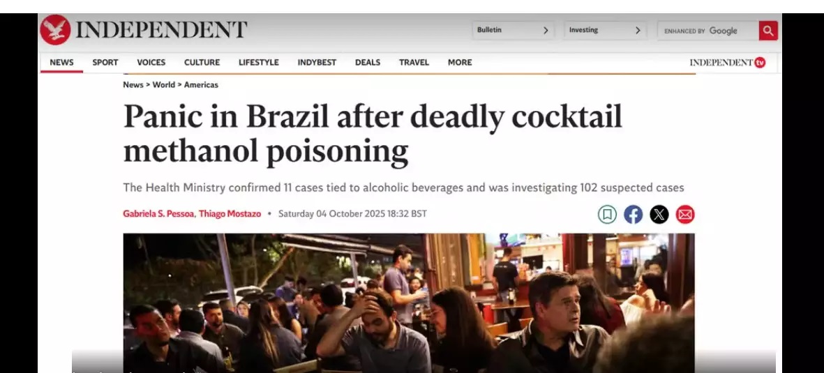 O canal norte-americano ABC News afirmou que brasileiros têm evitado consumir drinks após os recentes casos de contaminação por metanol. Segundo a emissora, a noite de sexta-feira (3) foi menos movimentada em um bar próximo à Avenida Paulista, uma das regiões mais agitadas de São Paulo.