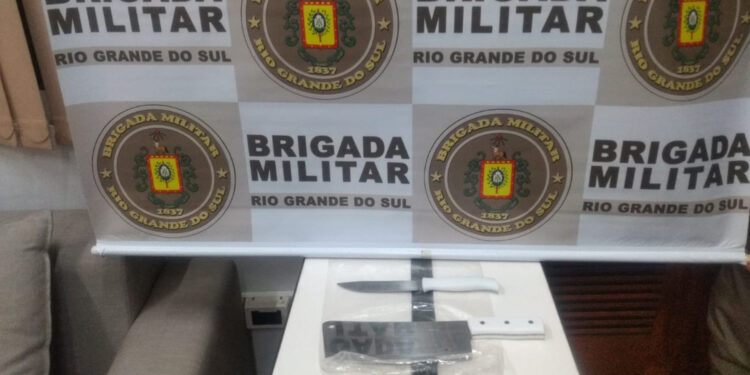Diante dos fatos a Brigada Militar, chegando no local visualizou o indivíduo de posse de duas facas uma em cada mão.