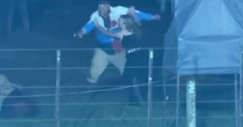 Imagens mostram o momento em que pessoas tentam intervir na briga. A vítima, identificada como Thiago Bueno (36) foge, porém cai próximo a uma arquibancada. A mulher tenta evitar que o autor faça os disparos, mas acaba sendo empurrada e recebendo um tapa na cara.