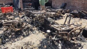 No galpão destruído pelo fogo, ficavam guardados cinco quadriciclos, um trator de cortar grama motorizado e diversas ferramentas elétricas.